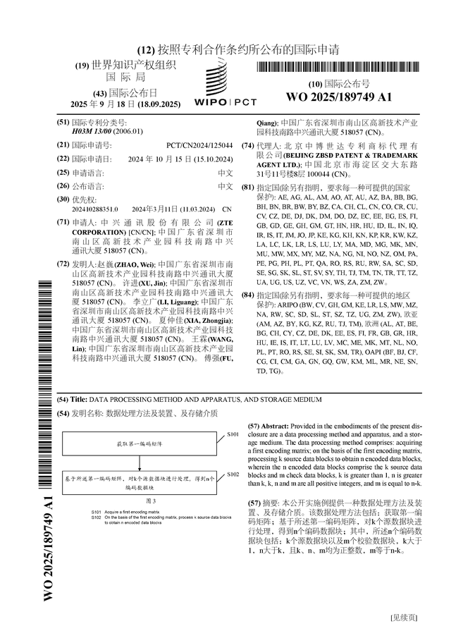 证券之星消息,根据企查查数据显示中兴通讯(000063)公布了一项国际专利申请,专利名为“数据处理方法及装置、及存储介质”,专利申请号为PCT/CN2024/125044,国际公布日为2025年9月18日。